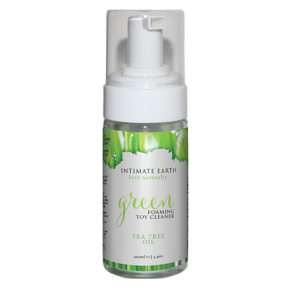 Green Tea Tree Oil Foaming Toy Cleaner from Intimate Organics safely and thoroughly cleans all plastic, silicone, glass and stainless steel toys, without the use of Triclosan, paraben, alcohol or other harsh chemicals. 100 ml