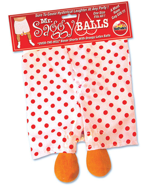Mr. Saggy Balls Boxer Shorts boxer shorts with droopy latex balls. Over the hill. Sure to cause hysterical laughter at any party. A must have adult gag gift. Imagine the look on your friends faces.