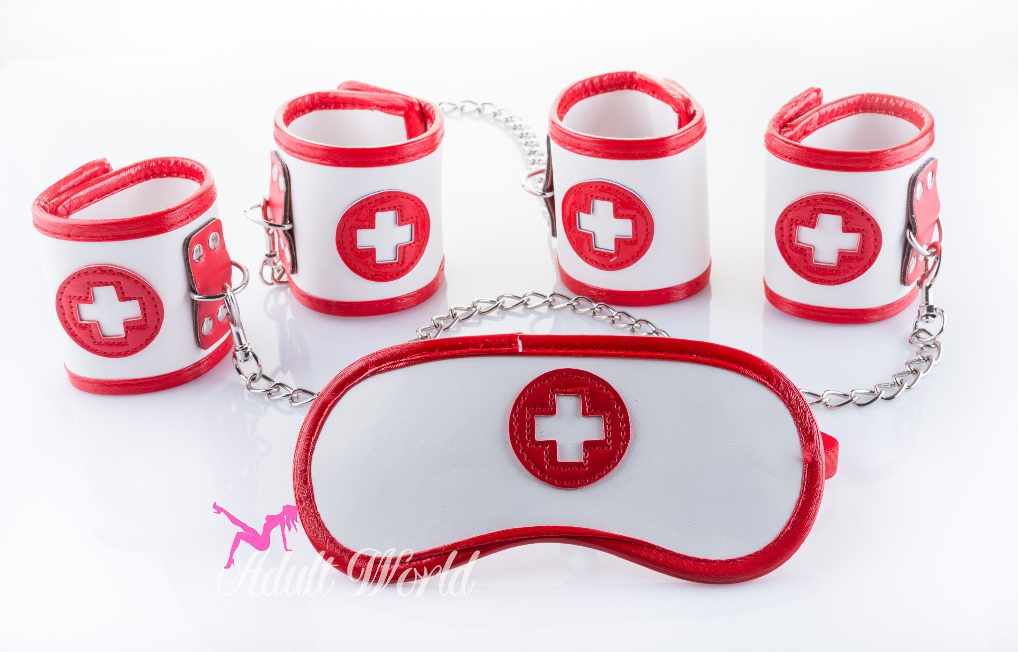 Naughty Nurse Bondage Kit. Does boredom in the bedroom have you feeling under the weather lately? Improve your bedside manner immediately with the playful Naughty Nurse Bondage Set. Take your role playing fantasies to the extreme and enjoy erotic nurse and patient scenarios with this sexy medical-themed bondage kit. Your complete prescription for pleasure is included in the box: Two vinyl wrist cuffs, two vinyl ankle cuffs, and a sexy vinyl love mask to round out the treatment. Both the wrist and ankle cuffs easily adjust to fit most sizes, while the love mask gently blocks your vision and keeps you in suspense. The snug wrist and ankle cuffs ensure your patient won’t escape any time soon, while the metal chains and clips prevent the patient from tampering with the procedure.