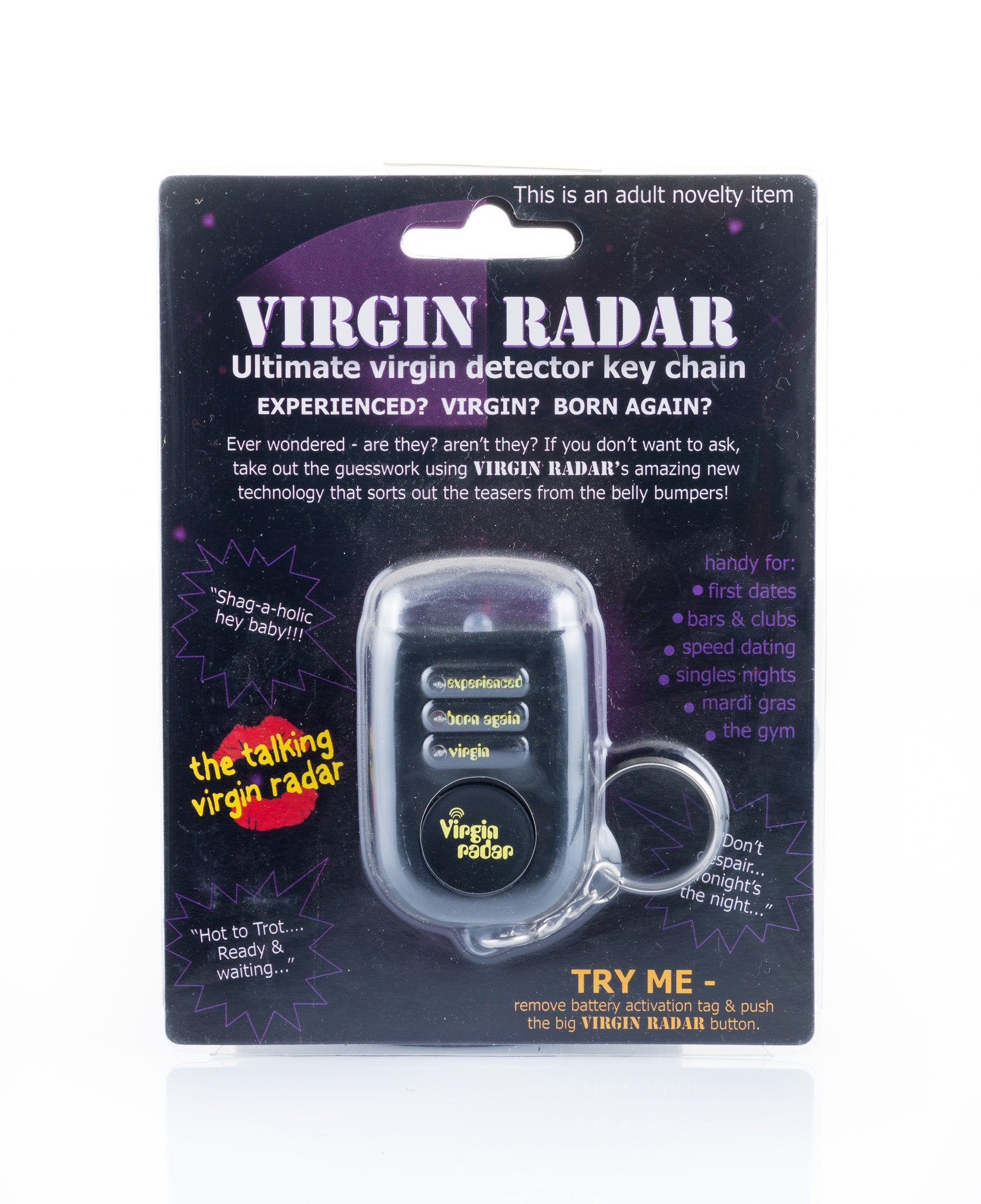 Aim the Virgin Radar Detector keychain at your subject and hit the Virgin Radar button. In just a few moments the Virgin Radar’s amazing technology will sort out the nymphos from the goody two shoes.