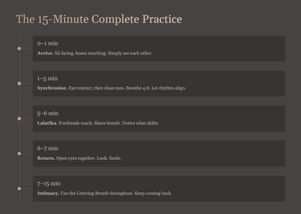 Minutes 1–5: Synchronise (Practice 1). Hold eye contact for one full minute — longer than is comfortable, which means you’re doing it right. Then close your eyes together. Begin breathing slowly: four counts in, six counts out. Listen for your partner’s breath. Let them fall into time with each other. Don’t force it. When you feel the synchronisation happen, stay with it for two to three more minutes.