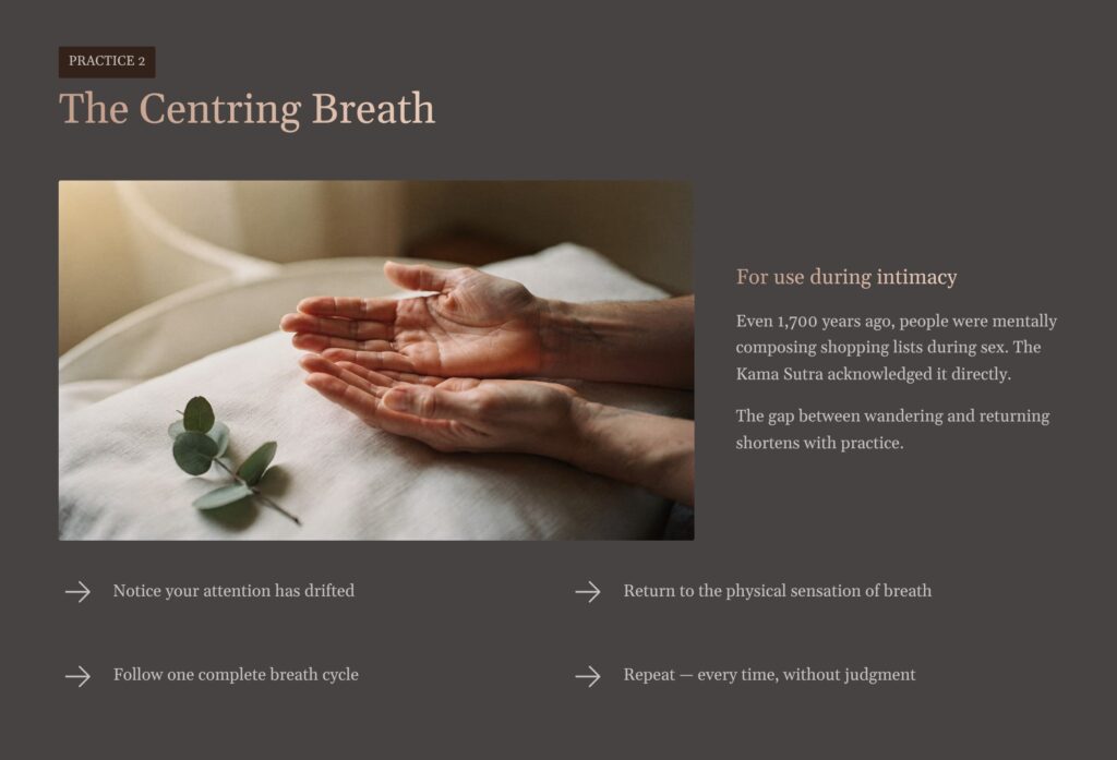 What makes it work is not the breath itself but the act of redirecting attention — which is a skill that improves with repetition, like a muscle. The first time you try this you will redirect your attention and be back in your head thirty seconds later. That is normal and expected. Redirect again. And again. Over weeks of practice, the gap between wandering and returning gets shorter, and the proportion of intimate time spent genuinely present rather than mentally elsewhere increases substantially.