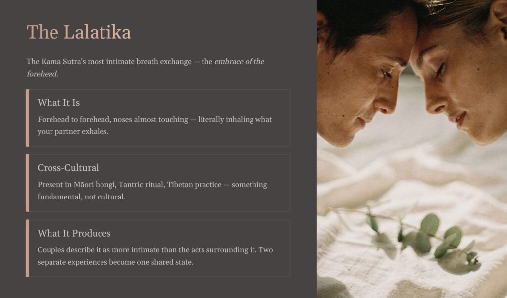 What it produces in practice is a particular quality of closeness that is distinct from physical closeness alone. When two people share breath at forehead-to-forehead proximity, with eyes closed, something quietens. The sense of being two separate people managing their separate experiences gives way, at least briefly, to something more like a shared state. Couples who practise this regularly describe it as one of the most intimate things they do together — more intimate, in many cases, than the acts that surround it.