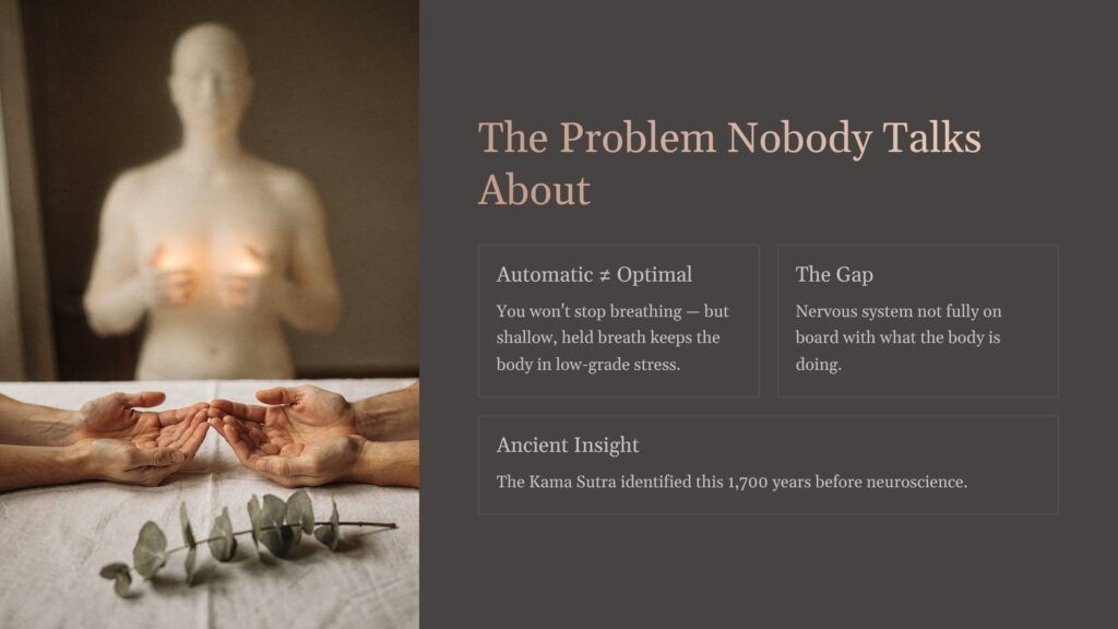 Here is something I observe consistently in my work with couples: when people are anxious, distracted, or performing — which describes a larger proportion of intimate encounters than most people admit — their breath becomes shallow, held in the chest, and irregular. And when breath is shallow and held, the body stays in a low-grade stress state regardless of what else is happening. Which means that for many couples, the nervous system is not fully on board with what the body is doing, and the experience reflects that gap.