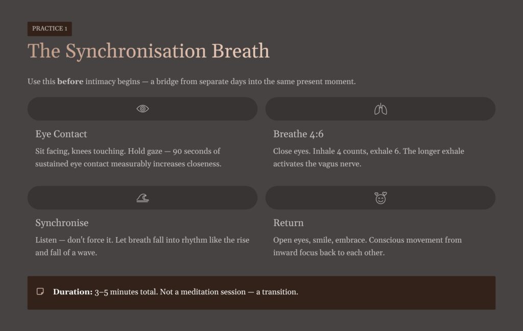 Don’t call it breathwork. Don’t mention Tantra. Just suggest sitting facing each other and breathing slowly together for a few minutes before things get started. Frame it as something you read about that you wanted to try. The three-minute synchronisation practice is sufficiently low-key that most sceptical partners can engage with it without feeling like they’ve been enrolled in a retreat.