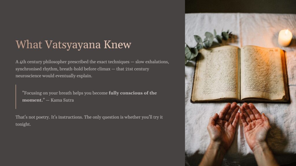 There is something quietly remarkable about a 4th century Indian philosopher prescribing the exact technique — slow exhalations, synchronised rhythm, breath-holding before climax — that 21st century researchers into the autonomic nervous system would eventually explain in detail.